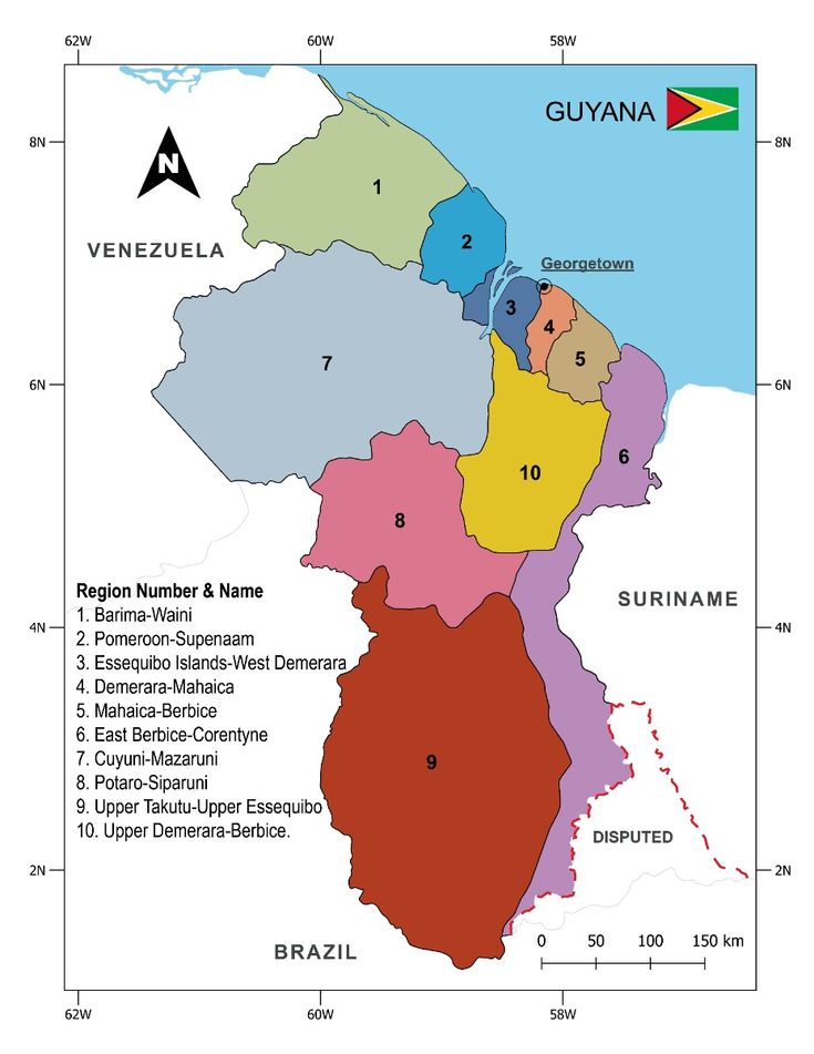 - Guyana is Located in South America, on the northern coast of South America, bordered by the Atlantic Ocean to the North, Venezuela to the West, Brazil to the South, and Suriname to the East. Within that Guyana has 10 administrative regions in the country.